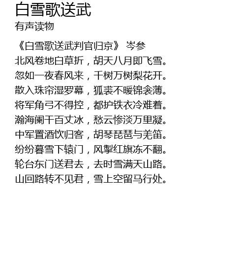 | [00:01.290] | 《白雪歌送武判官归京》 岑参 |