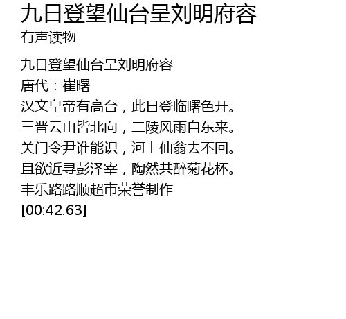 | [00:02.14] | jiǔ rì dēng wàng xiān tái chéng liú míng fǔ róng |