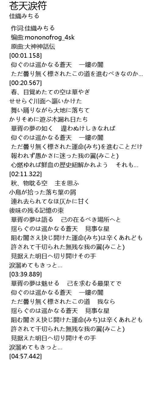 | [04:38.550] | 許されて千切られた無残な我の翼(みこと) |