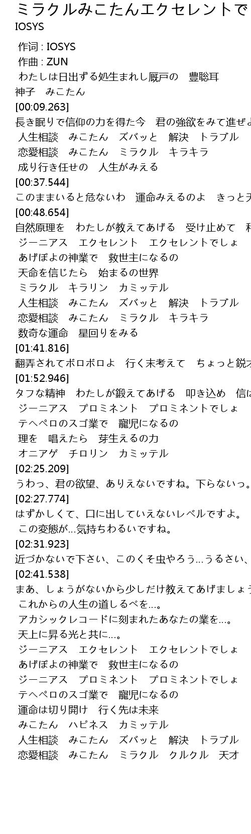 | [03:28.708] | 恋愛相談 みこたん ミラクル クルクル 天才 |