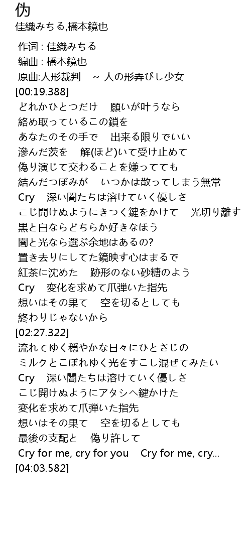 | [00:12.998] | 原曲:人形裁判 ~ 人の形弄びし少女 |