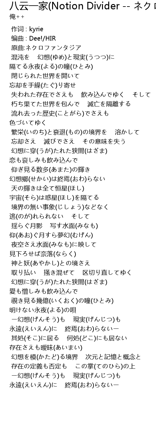 | [00:17.297] | 混沌を 幻想(ゆめ)と現実(うつつ)に 隔てる永夜(よる)の瞳(ひとみ) |