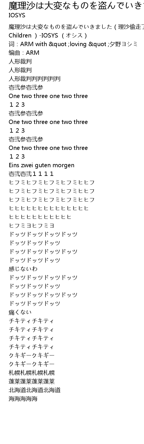 | [00:00.00] | 魔理沙は大変なものを盗んでいきました(理沙偷走了重要的东西)(曲:人形裁判~人の形弄びし少女/Romantic Children )-IOSYS (オシス) |