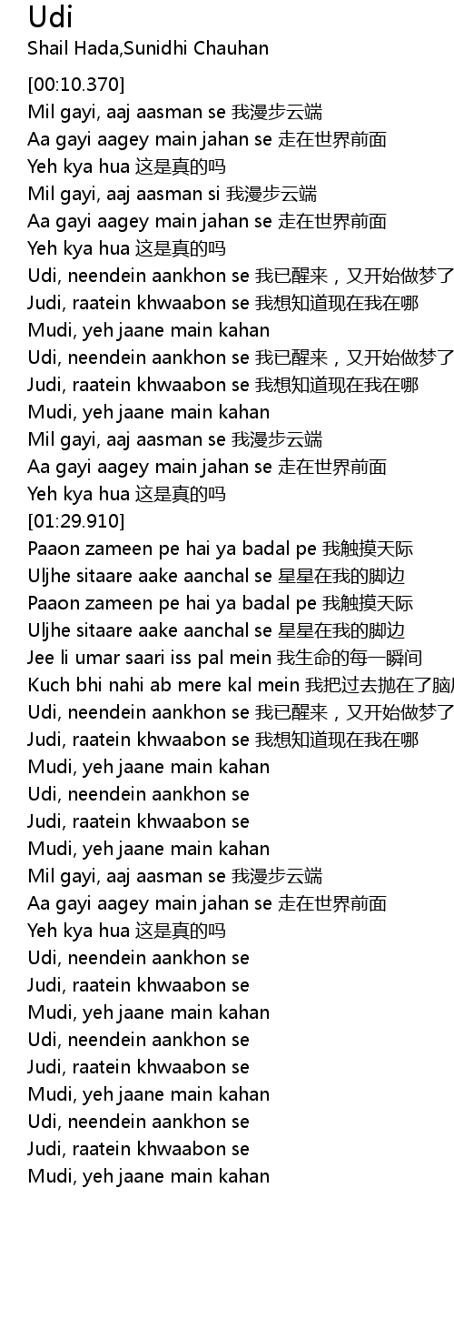 | [02:10.200] | Udi, neendein aankhon se 我已醒来,又开始做梦了 |