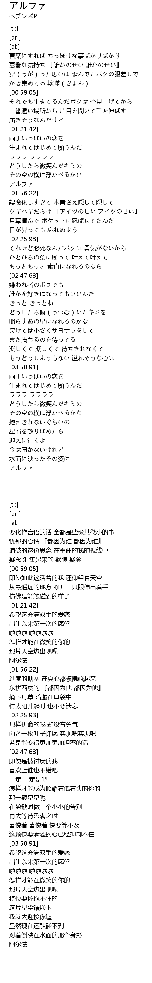 | [02:08.30] | ツギハギだらけ 『アイツのせい アイツのせい』 |