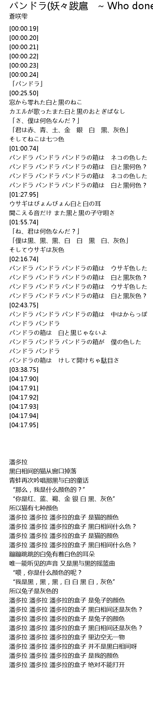 | [02:23.75] | パンドラ パンドラ パンドラの箱は 白と黒灰色? |