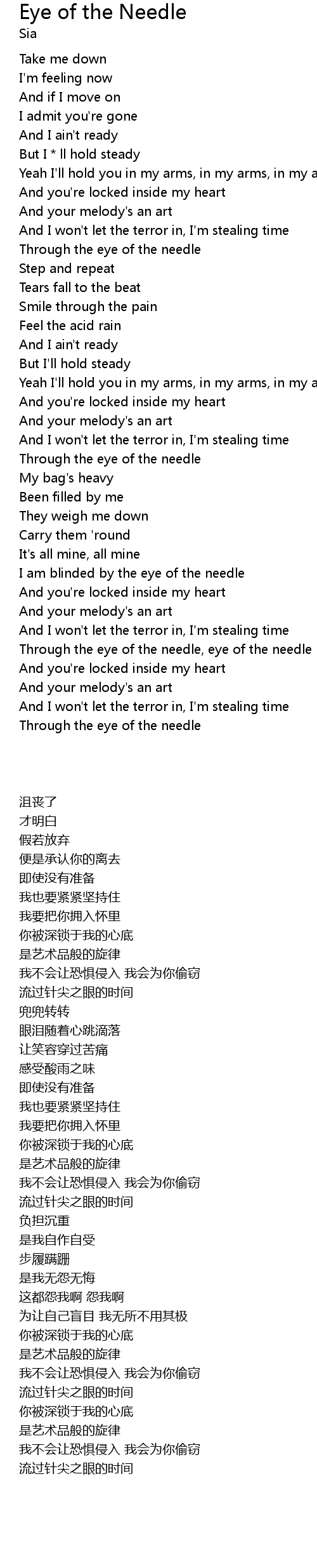 | [03:14.330] | Through the eye of the needle, eye of the needle |