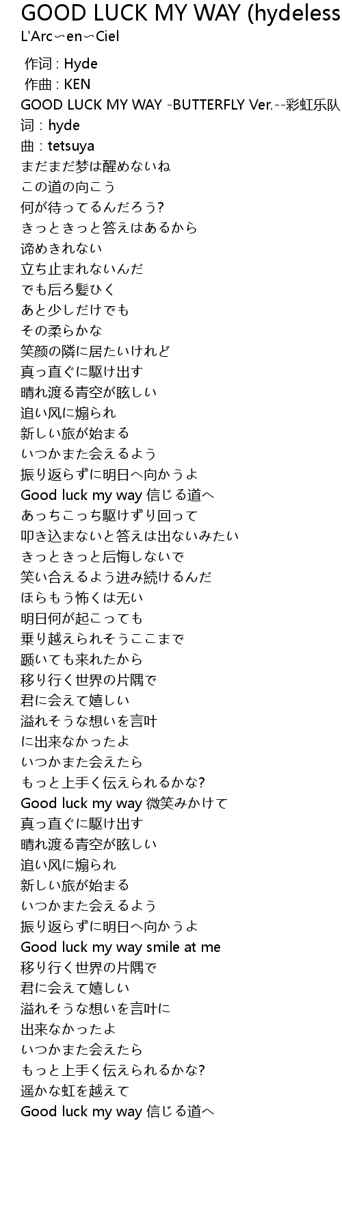 | [00:00.930] | GOOD LUCK MY WAY -BUTTERFLY Ver.--彩虹乐队 |