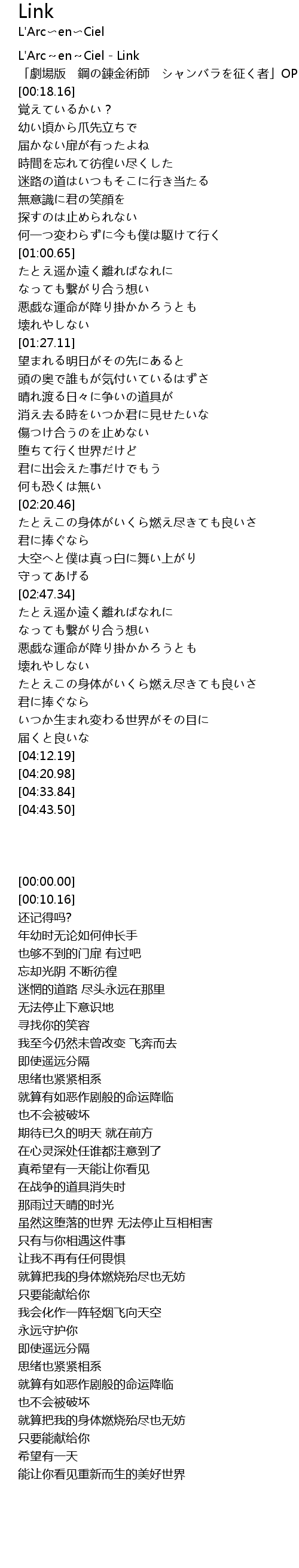 | [00:00.00] | L'Arc~en~Ciel - Link |