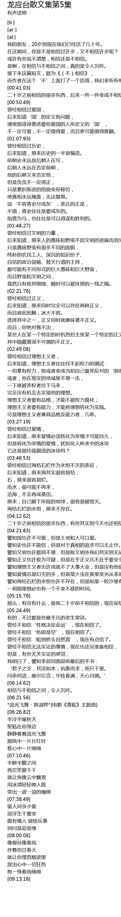 | [04:14.36] | 二十岁之前相信的很多东西,有些其实到今天也还相信。 |