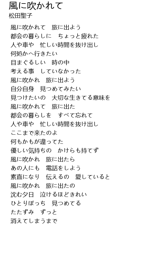 | [03:26.346] | 風に吹かれ 旅に出たの |
