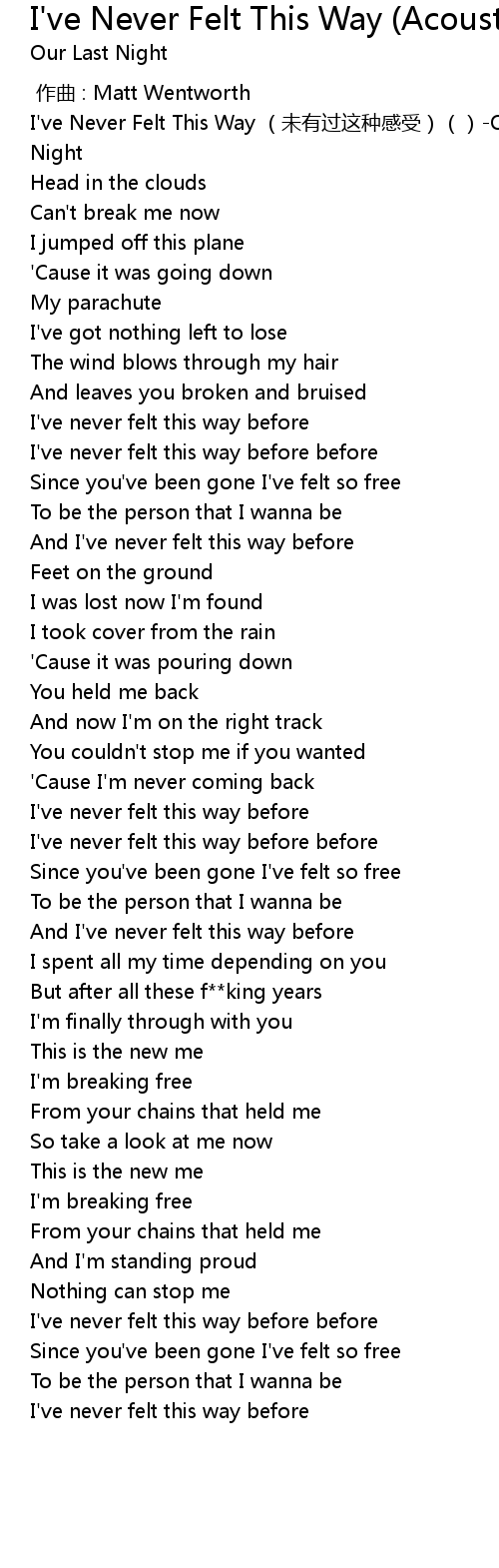 | [00:00.00] | I've Never Felt This Way (未有过这种感受)()-Our Last Night |