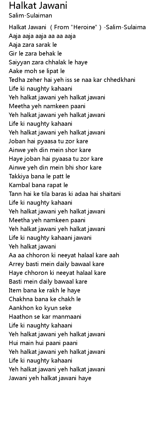 | [00:00.360] | Halkat Jawani From " Heroine" SalimSulaiman Sunidhi Chauhan |