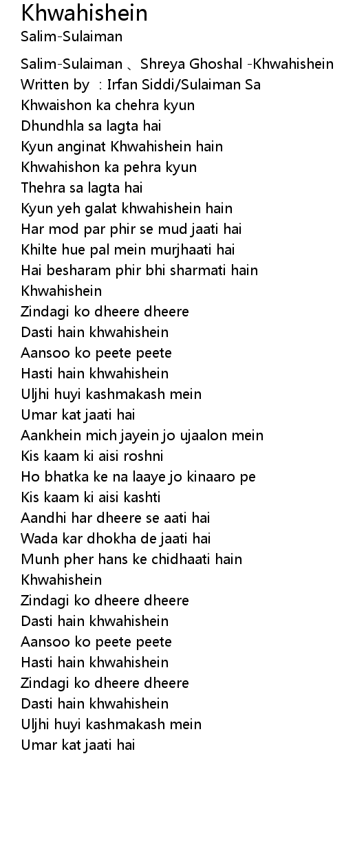 | [00:00.19] | SalimSulaiman Shreya Ghoshal Khwahishein |