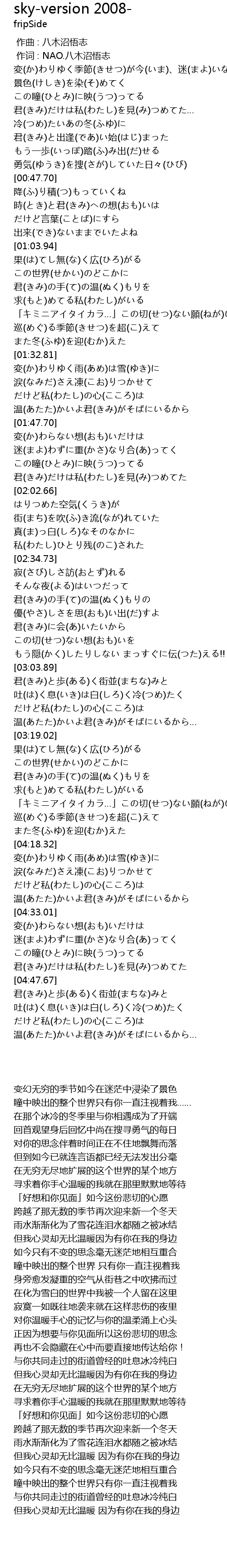 | [03:04.19] | 君(きみ)と歩(ある)く街並(まちな)みと 吐(は)く息(いき)は白(しろ)く冷(つめ)たく |