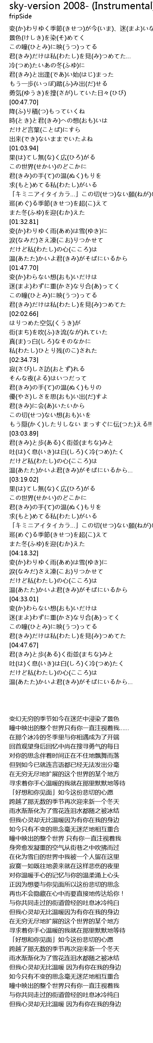 | [00:48.15] | 降(ふ)り積(つ)もっていくね 時(とき)と君(きみ)への想(おも)いは |