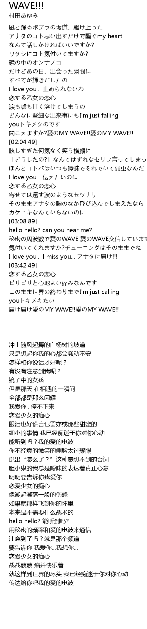 | [03:18.81] | 秘密の周波数で愛のWAVE 愛のWAVE交信しています |