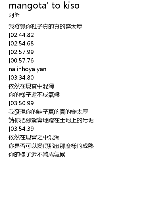| [02:41.59] | 我發現你的鞋子真的真的穿太厚 |