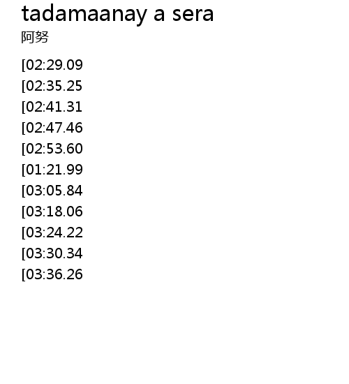 | [01:50.76][03:36.26][04:00.67] | i falocoh’ nonniyam o pa oripay ko sera |