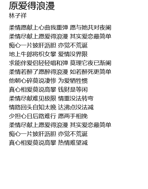 | [00:16.32] | róu qíng jǐn xiàn shàng yuàn ài dé làng màn qí shí ài liàn zuì jiǎn dān |
