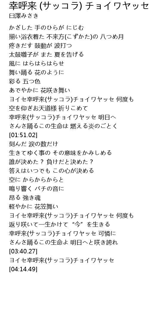 | [04:09.38] | ヨイセ幸呼来(サッコラ)チョイワヤッセ |