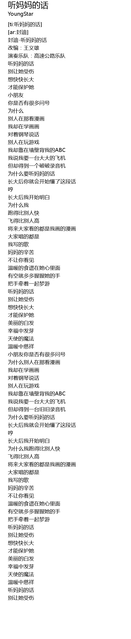 | [00:00.467] | 封迪-听妈妈的话 |