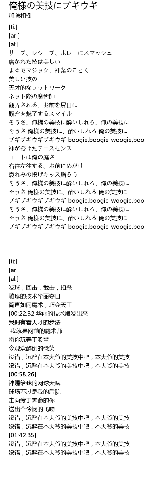 | [00:58.26] | ブギブギウギブギウギ boogie,boogie-woogie,boogie-woogie |