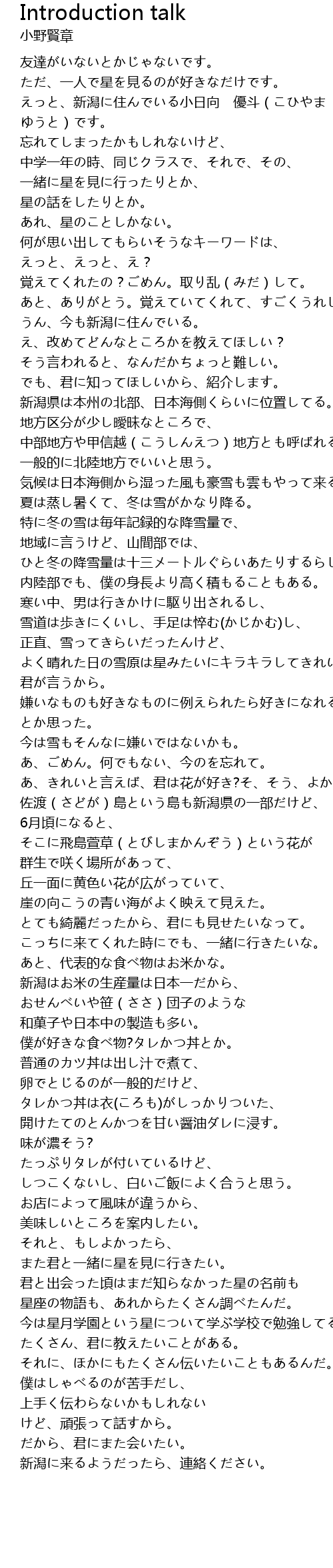 | [00:13.62] | えっと、新潟に住んでいる小日向 優斗(こひやま ゆうと)です。 |