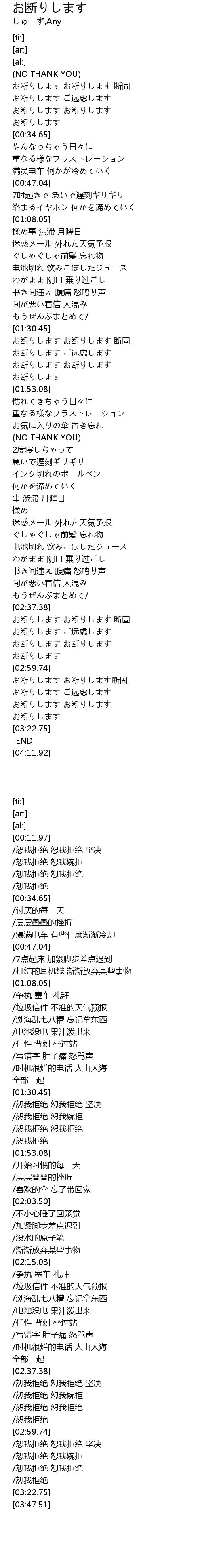 | [01:08.75] | 揉め事 渋滞 月曜日 |
