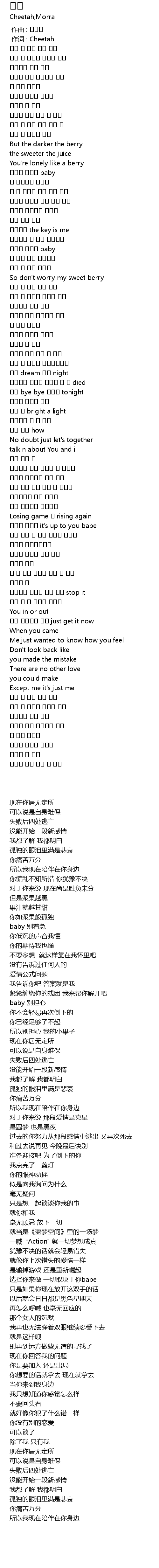 | [00:01.00] | 作词 : Cheetah |