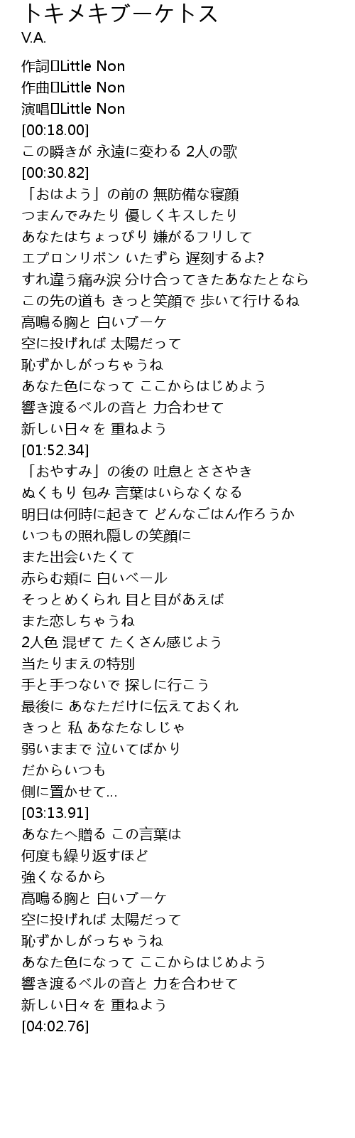| [03:30.63] | 高鳴る胸と 白いブーケ |