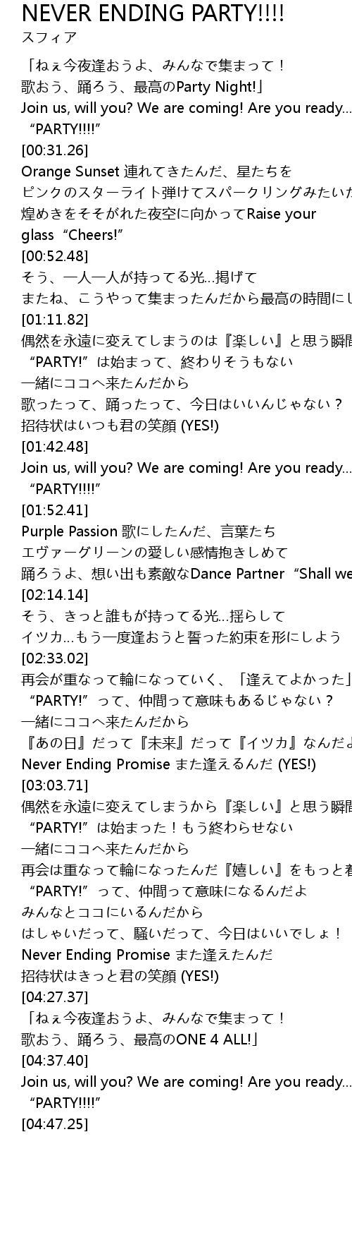 | [03:42.83] | “PARTY!”は始まった!もう終わらせない 一緒にココへ来たんだから |