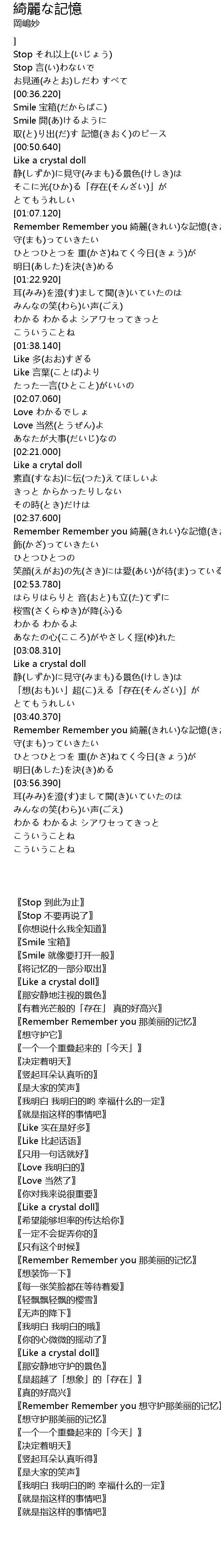 | [01:08.930] | Remember Remember you 綺麗(きれい)な記憶(きおく) |