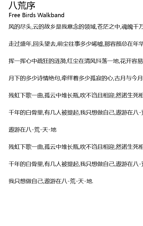 | qiān nián de bái gǔ lǐ, yǒu jǐ rén bèi tí qǐ, wǒ zhǐ xiǎng zuò zì jǐ, áo yóu zài bā huāng tiān dì. | |