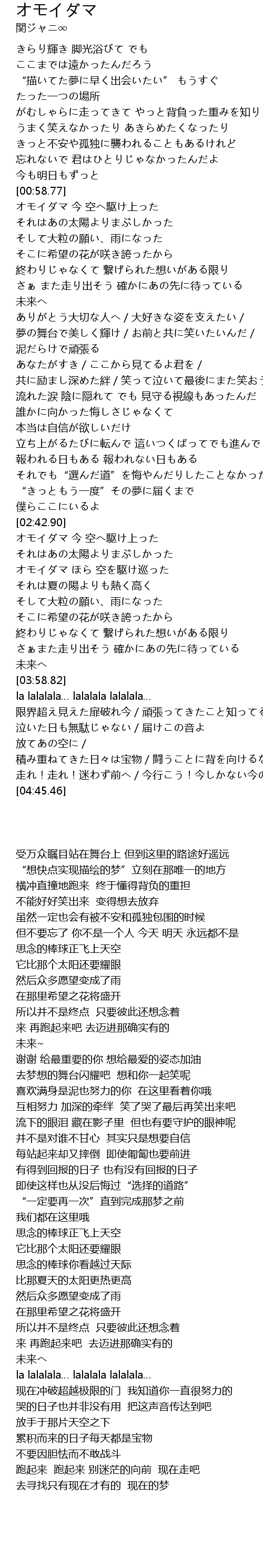 | [04:21.42] | 限界超え見えた扉破れ今/頑張ってきたこと知ってるから/ |