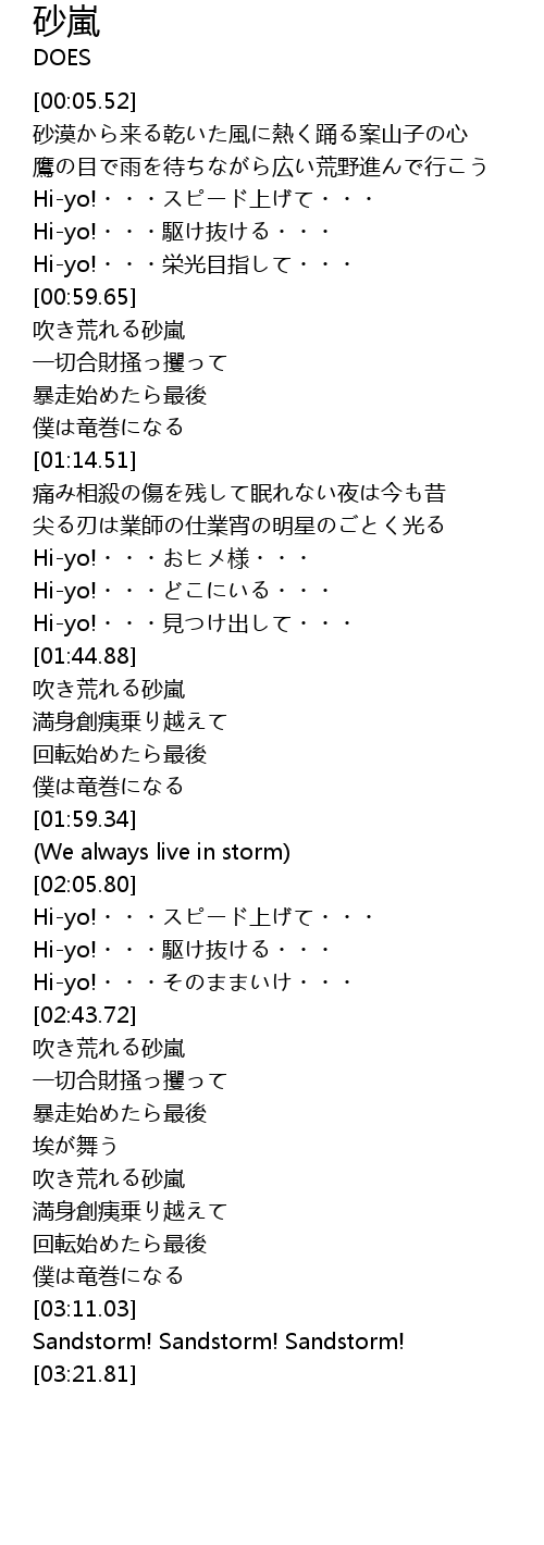 | [02:56.99] | 吹き荒れる砂嵐 |
