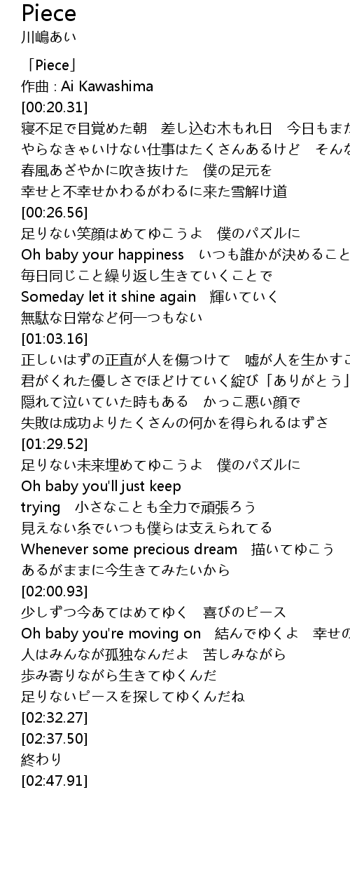 | [00:08.31] | 作曲∶Ai Kawashima |