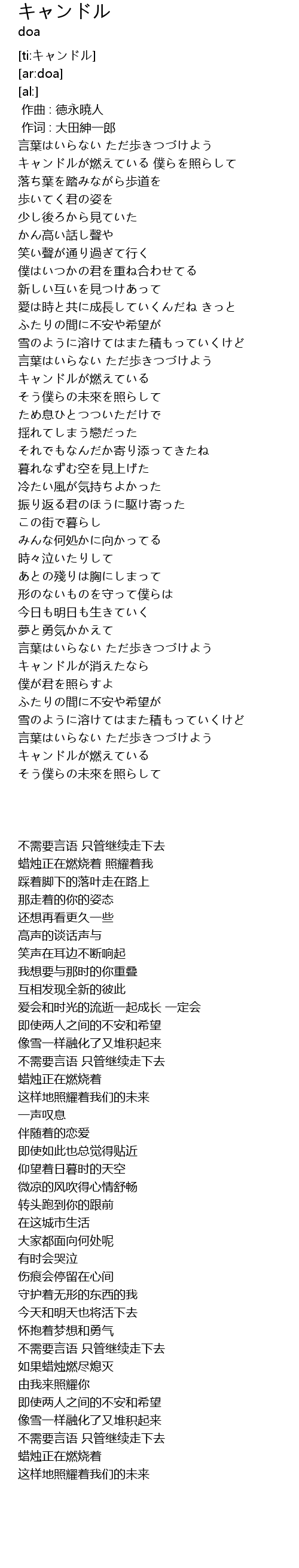 | [00:12.92] | キャンドルが燃えている 僕らを照らして |