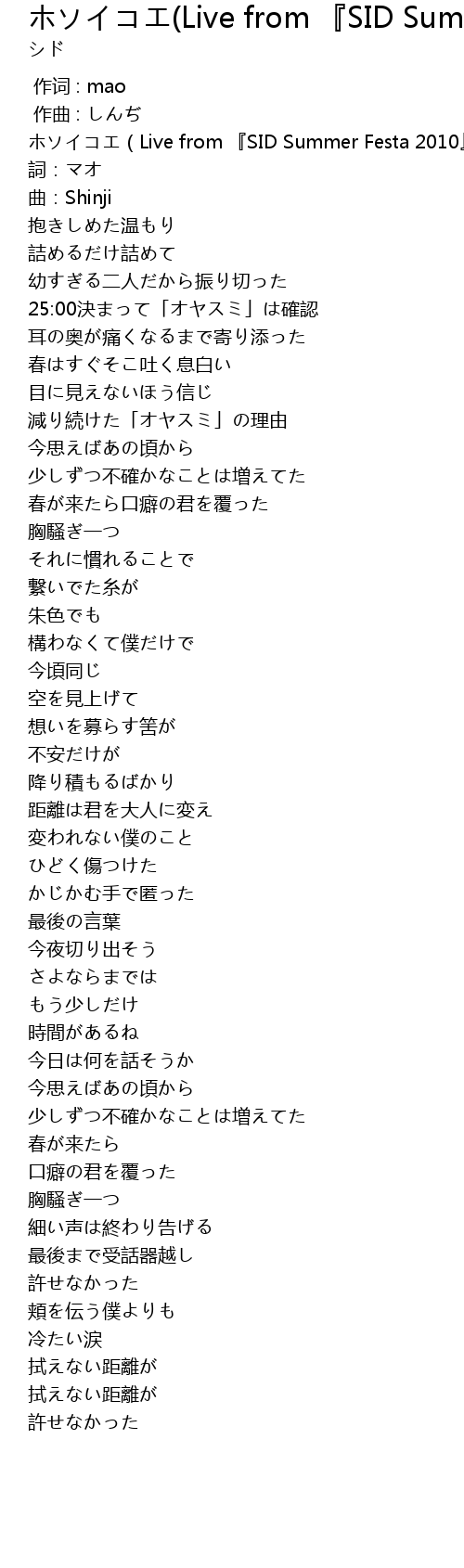 | [00:00.480] | ホソイコエ(Live from 『SID Summer Festa 2010』)-SID |