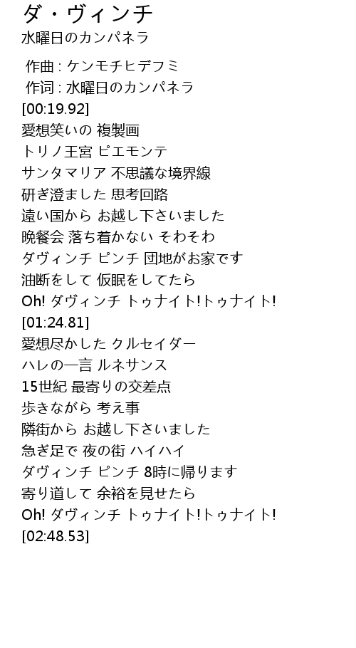 | [01:19.72] | Oh! ダヴィンチ トゥナイト!トゥナイト! |