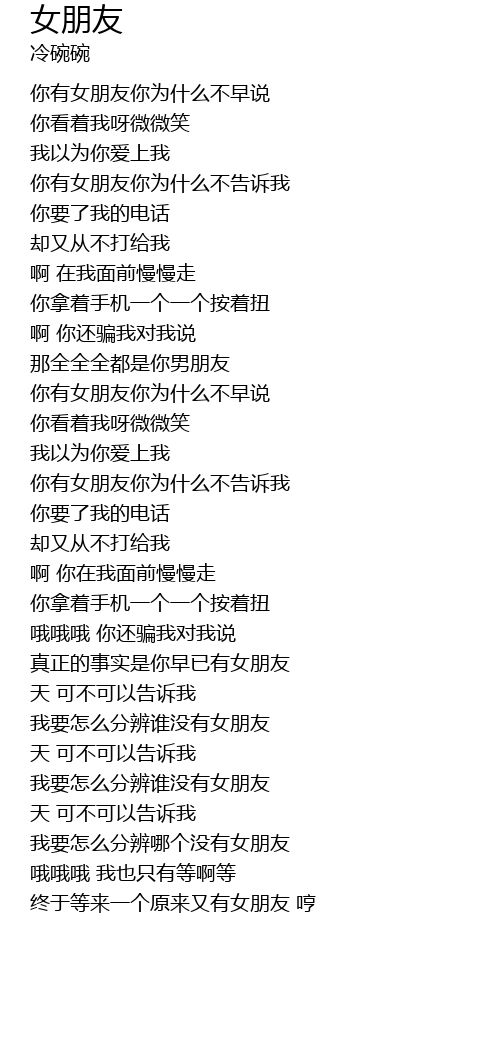 | [01:16.98] | nǐ yǒu nǚ péng yǒu nǐ wèi shí me bù gào sù wǒ |