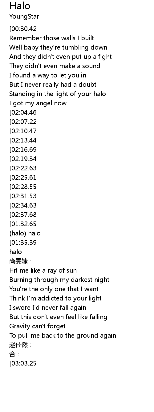 | [01:22.70][02:34.63] | Baby I can feel your halo |