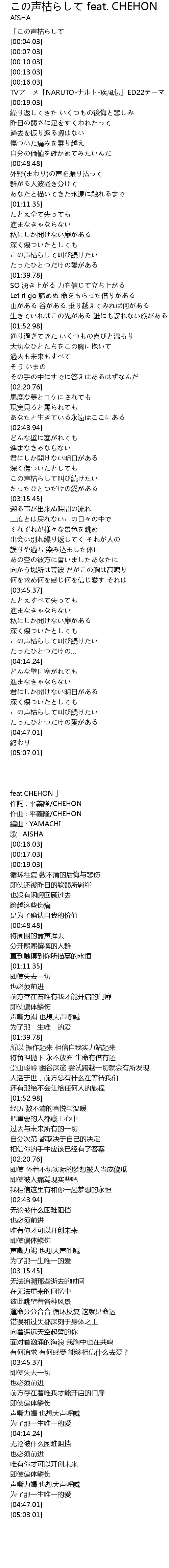 | [00:17.03] | TVアニメ「NARUTO-ナルト-疾風伝」ED22テーマ |