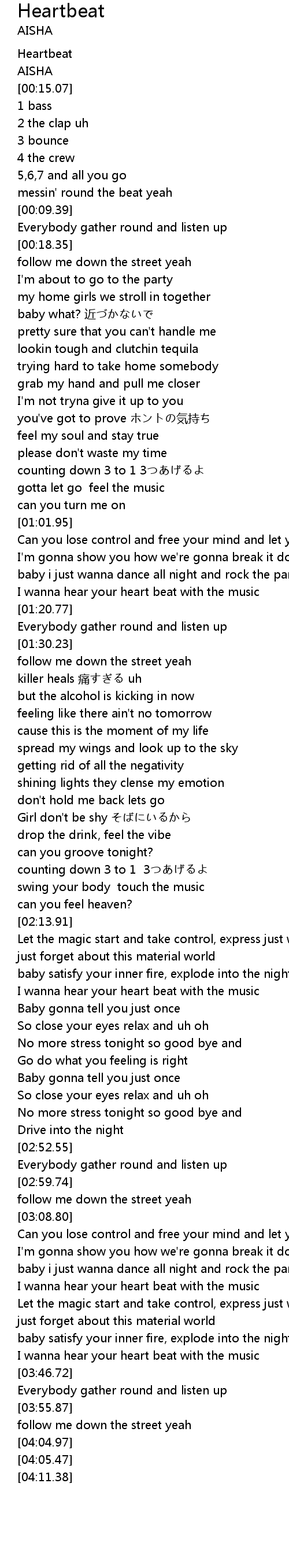| [03:23.67] | I wanna hear your heart beat with the music |