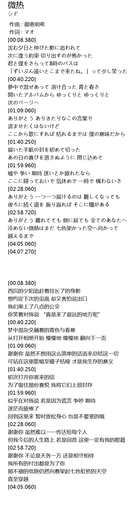 | [01:10.420] | ありがとう ありきたりなこの言葉で 済ませたくはないけど |