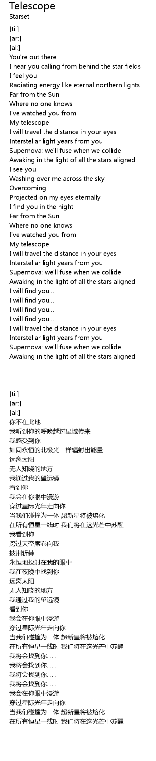 | [00:04.37] | I hear you calling from behind the star fields |