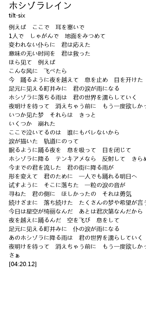 | [03:44.98] | あのホシゾラに降る雨は 君の世界を濡らしていく |