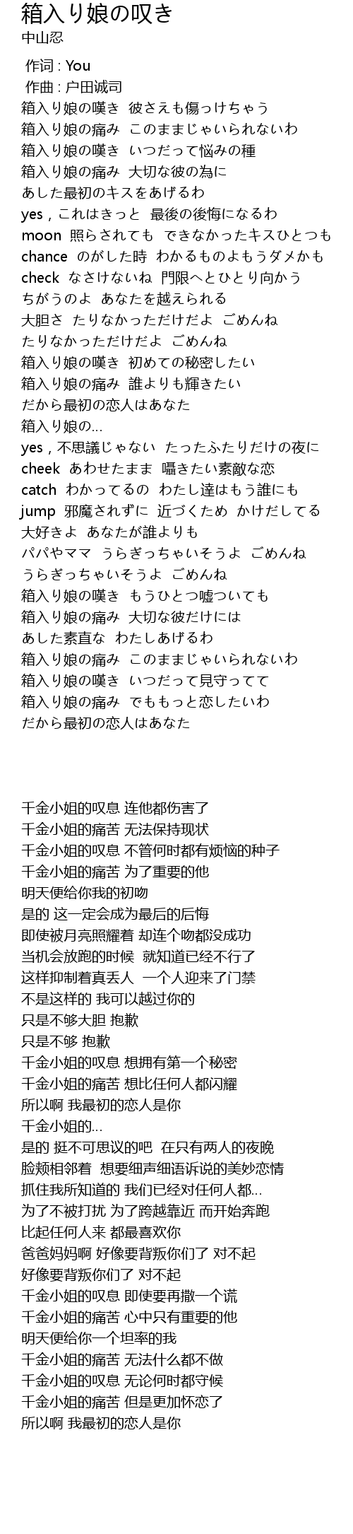 | [00:19.510] | 箱入り娘の嘆き いつだって悩みの種 |