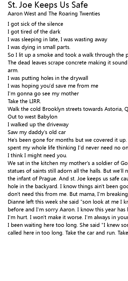 We sat in the kitchen my mother's a soldier of God and so paintings of Jesus and statues of saints still adorn all the halls. But we'll never go hungry thanks to the infant of Prague. And st. Joe keeps us safe cause we buried him deep in a hole in the backyard. I know things ain't been good since dad died. I know you don't need this from me. But mama, I'm breaking there's no light in the dark. Dianne left this week she said "son look at me I know we ain't been this low before and I'm sorry Aaron. I know this year has been hard. If you're hurt then I'm hurt. I won't make it worse. I'm always in your corner." Some things wrong. I been waiting here too long. She said "I knew something was wrong. You ain't called here in too long. Take the car and run. Take the car and run." |