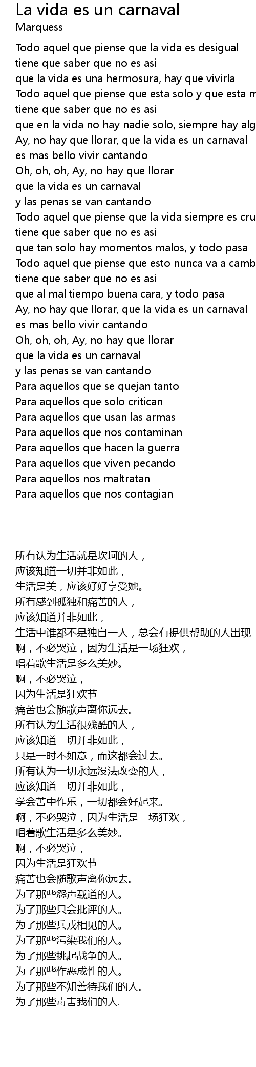 | [00:38.49] | Ay, no hay que llorar, que la vida es un carnaval |